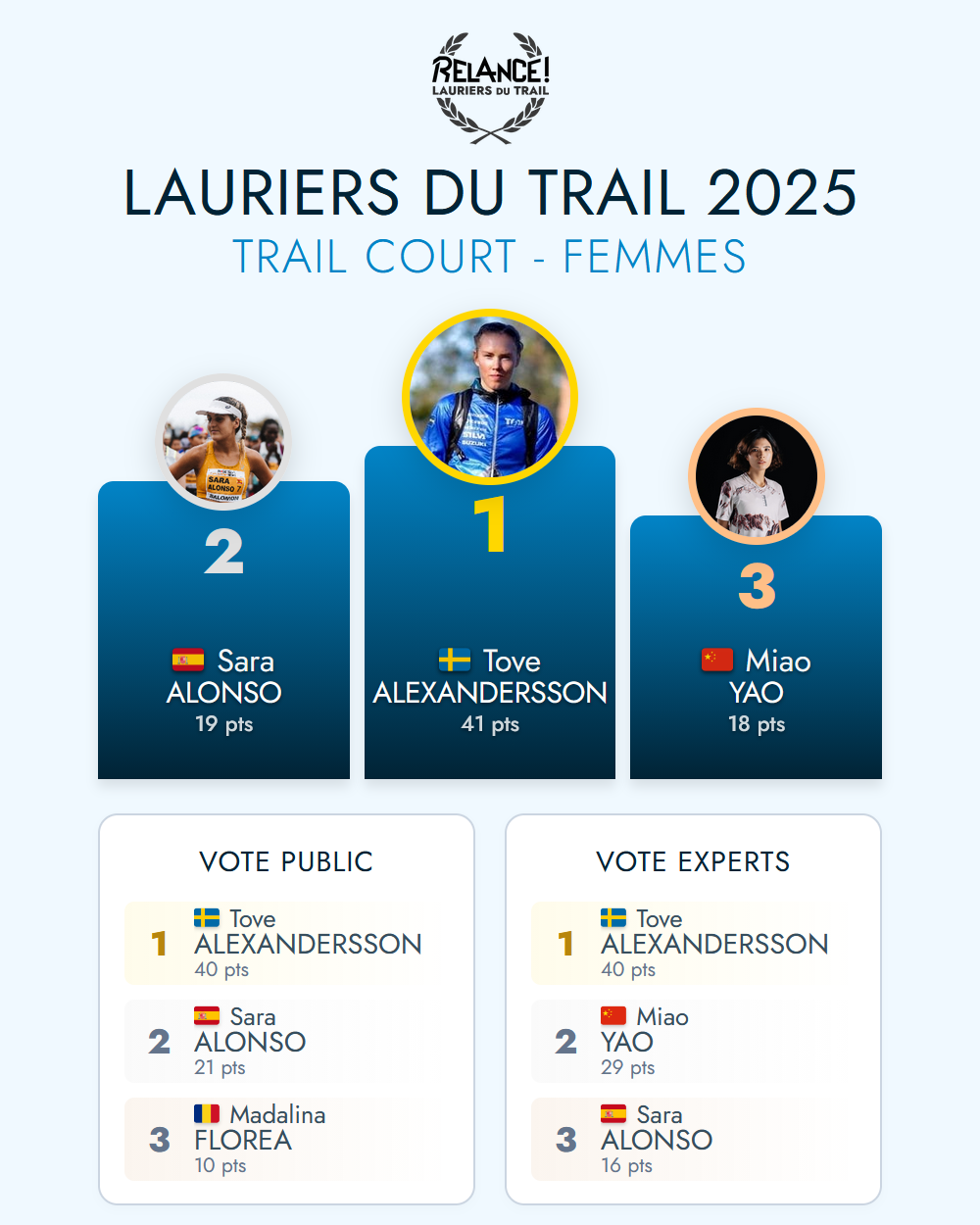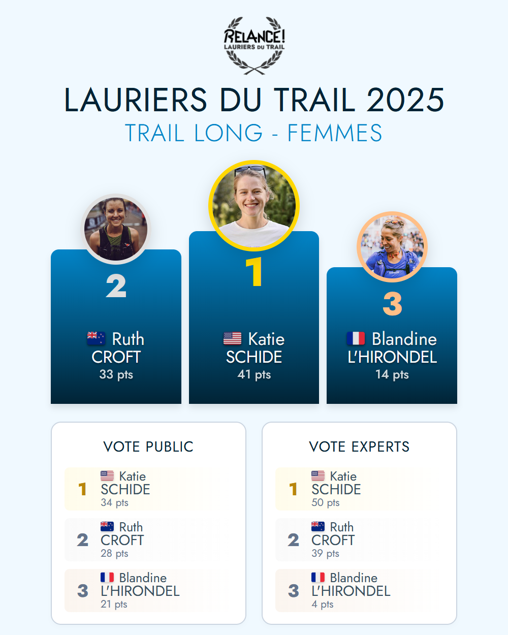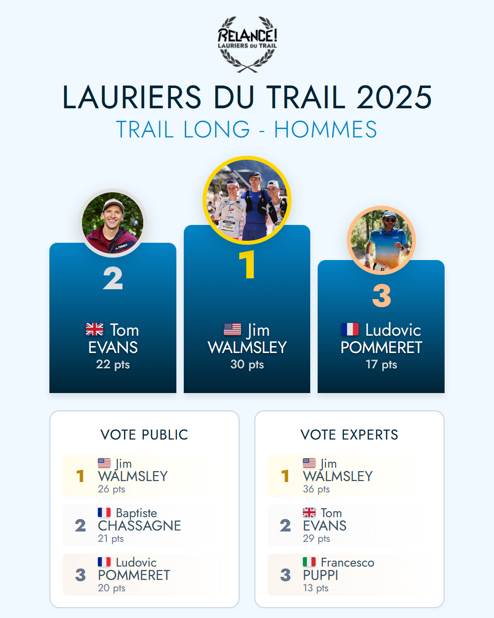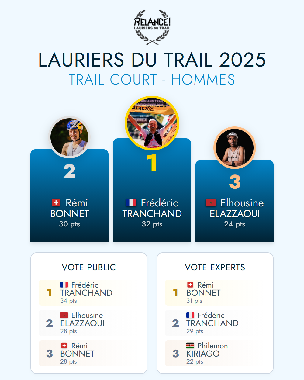 Les Lauriers du Trail visent à récompenser les meilleurs traileurs et traileuses de l'année, sur la base de leurs réalisations et performances sur les principales compétitions au niveau mondial, et selon différents critères*. Vous êtes toutes et tous invités à voter pour les meilleurs de chaque catégorie* présentés ci-dessous. Prenez soin de lire le résumé de leur saison avant de voter.